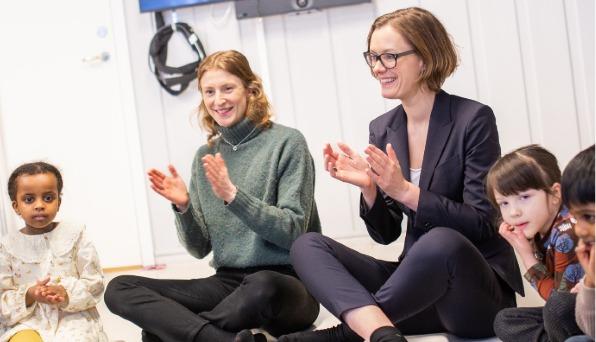 Sangaktivitet kan brukes som metodisk verktøy for å nå mål i rammeplanen. På bildet: Daværende kulturminister Anette Trettebergstuen på inspirasjonstur til to Syngende barnehager på Tøyen i Oslo.